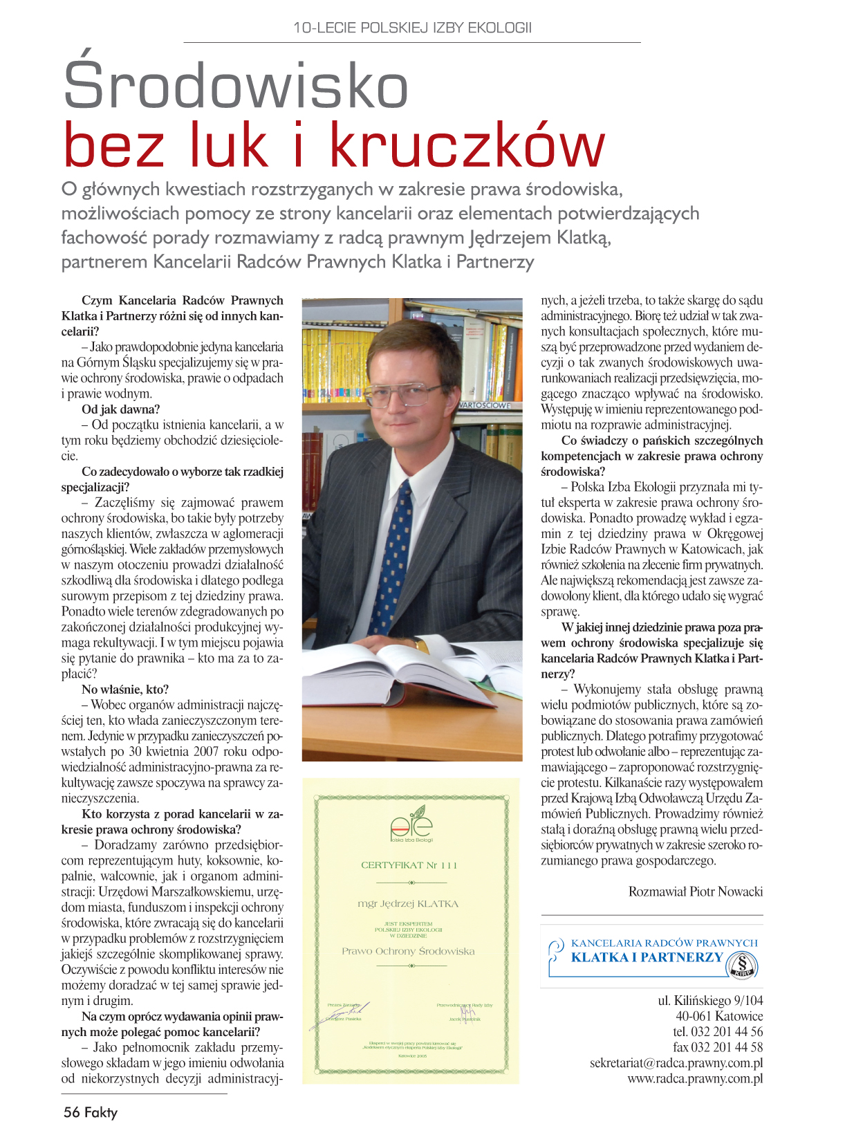 Na łamach Magazynu Gospodarczego FAKTY nr 5. pojawił się artykuł pt. Środowisko bez luk i kruczków dotyczący dotyczący głównych kwestii rostrzyganych w zakresie prawa środowiska, możliwości pomocy ze strony kancelarii oraz elementów potwierdzających fachowość porady.
